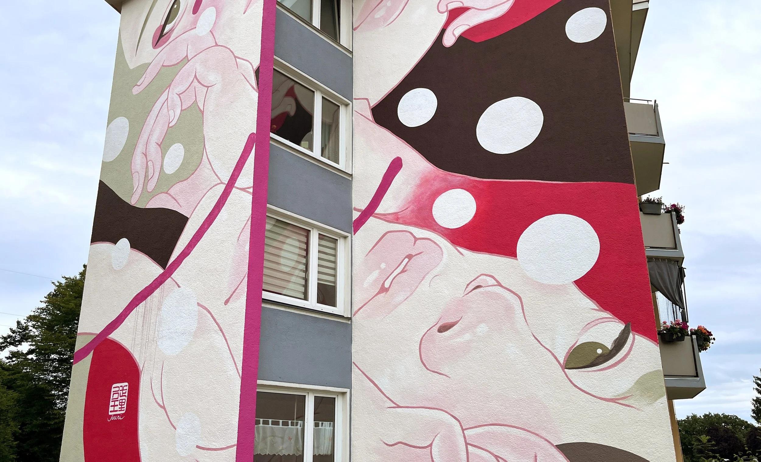 From the Wuppertal Tanzt Instagram: “The Japanese Street Artist JUURI from Oklahoma City transformed Pina's dance piece TEN CHI into a mural at Domagkweg 46 for @wuppertal_tanzt.