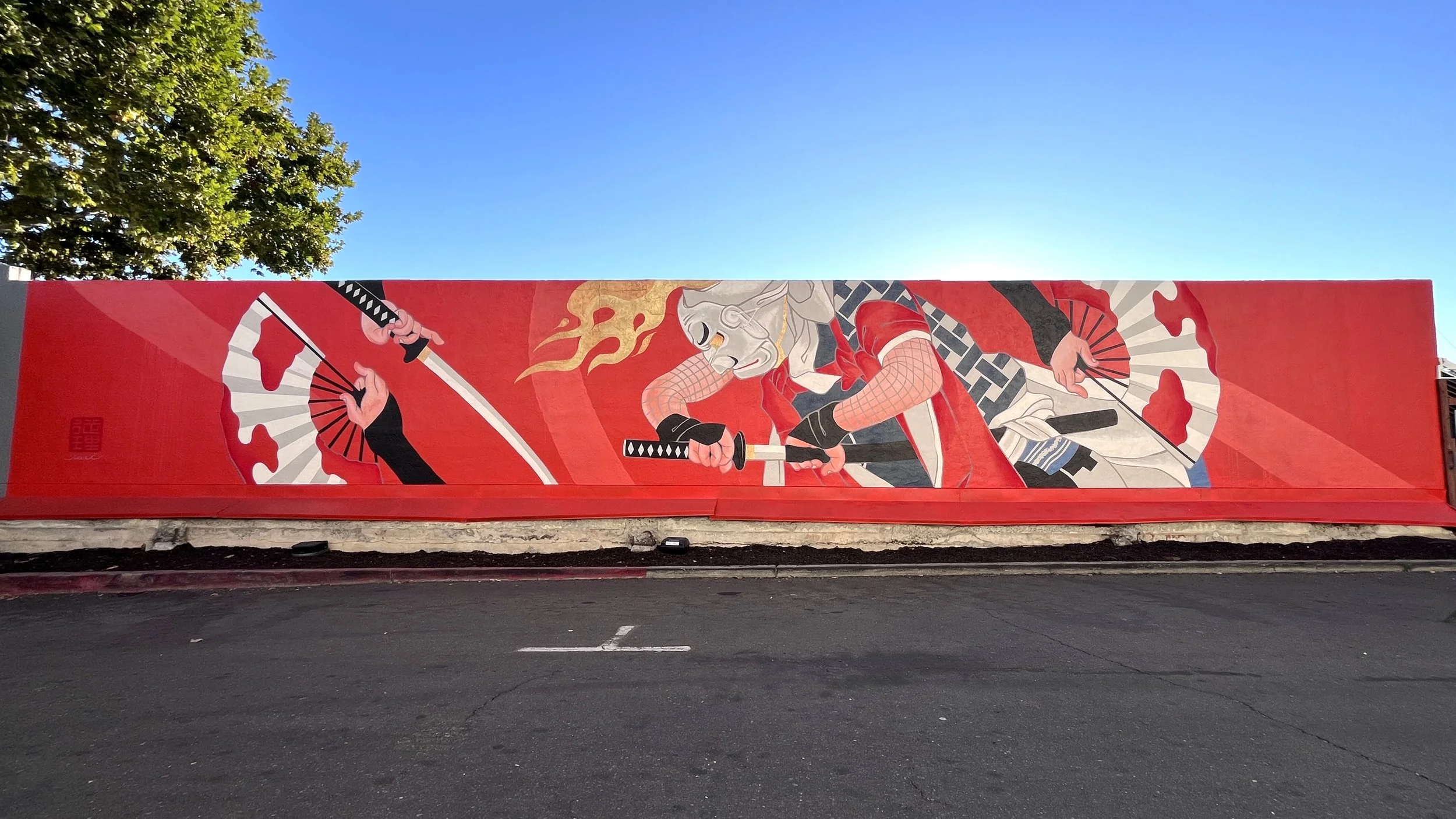 This piece was painted for the Sister Cities organization between Concord, CA and Kitakami, Japan. The mural depicts a famous traditional dance which is unique to the Kitakami area. A delegation from Kitakami including the mayor came to see the finished mural.